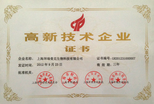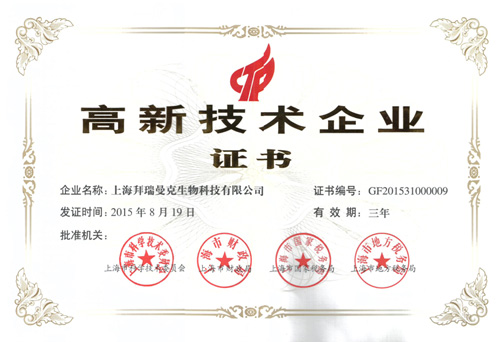 上海拜瑞曼克生物科技有限公司获得《高新技术企业》称号