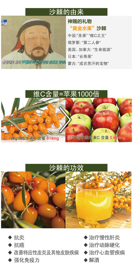 『顶棘』沙棘果汁为公司自主研制的带有功能性保健成分饮品。 公司在新疆阿勒泰地区拥有2万亩的高效沙棘种植示范基地。沙棘维生素含量极为丰富,尤其是维生素C的含量居果蔬之冠,因此有“维生素宝库”之称。沙棘原果口感酸涩,经公司韩国技术团队研制后使之成为具有天然色泽和新鲜沙棘果酸独特口味的天然保健营养饮品。
